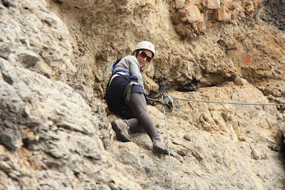 Day 1 involved a morning canyoning, more aptly described as sliding down a fast flowing river and jumping over waterfalls. The occasional abseil added to the amusement and gave everyone a great introduction to basic rope work that would be invaluable for the Dolomites. Adam, preferring more sedate activities chose to sit out of this adventure, but promised to float down a river in a tyre tube, beer in hand, instead. We were joined on the canyoning by some older Brits, whose only female member produced the funniest moment of the day. After jumping off the first waterfall (proceeded by much hesitation) she surfaced and remarked, “I wanted to go kayaking!”. The whole group was a lot of fun and quite a few of us overcame our fears of jumping of high ledges into water.